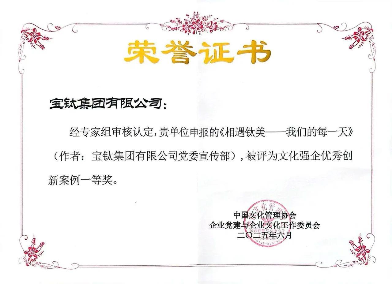 近日,由寶鈦集團黨委宣傳部、文化新聞中心創(chuàng)作的微紀錄片《相遇鈦美——我們的每一天》,被中國文化管理協(xié)會企業(yè)黨建與企業(yè)文化工作委員會評為文化強企優(yōu)秀創(chuàng)新案例一等獎。這一榮譽的獲得,不僅是對該微紀錄片藝術價值和文化內(nèi)涵的高度認可,更是寶鈦集團企業(yè)文化建設工作成效的有力證明。