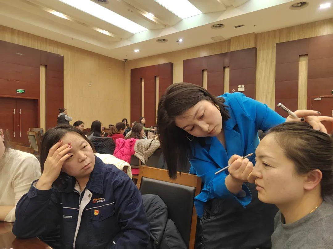 實(shí)操伊始,化妝老師挑選了一位女職工充當(dāng)模特進(jìn)行上臺(tái)試裝,根據(jù)模特儀容儀表現(xiàn)場(chǎng)教學(xué),并通過(guò)互動(dòng)的方式耐心細(xì)致地對(duì)各個(gè)化妝環(huán)節(jié)一一講解。示范完畢后,在一陣陣的驚嘆聲中,大家躍躍欲試,對(duì)著鏡子“活學(xué)活用”,在自行化妝或彼此化妝的道路上愈發(fā)明快。期間,化妝老師不停地穿梭在女工們身邊,手把手地教大家化妝的技巧和要領(lǐng),用簡(jiǎn)單明了的方法將專(zhuān)業(yè)的化妝知識(shí)生活化、具象化,使得女工們快速的了解和掌握了化妝的基本要領(lǐng)?;顒?dòng)最后,化妝師貼心安排了修眉環(huán)節(jié),根據(jù)各位女工臉型精心修剪眉形,為女工送去最美的祝福。