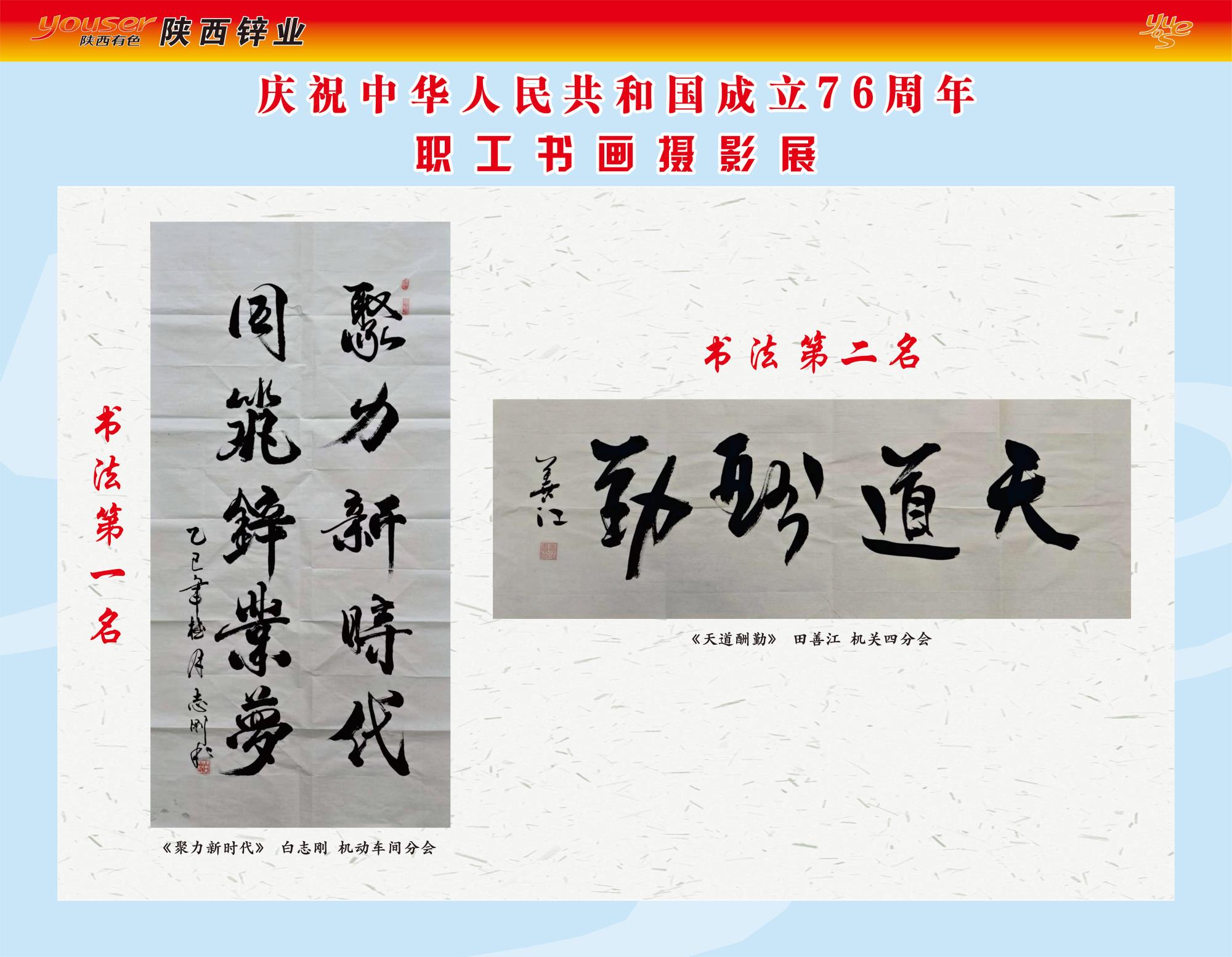 書法類:一等獎(jiǎng)機(jī)動(dòng)車間分會(huì)《聚力新時(shí)代》;二等獎(jiǎng)機(jī)關(guān)四分會(huì)《天道酬勤》;三等獎(jiǎng)鋅粉車間分會(huì)《勞動(dòng)最光榮》。