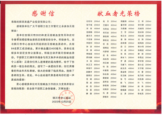 近日,陜西美鑫公司收到了一封來自銅川市中心血站的感謝信,信中銅川市中心血站表達了對陜西美鑫公司青年員工積極參與無償獻血的感謝之情和誠摯敬意。
