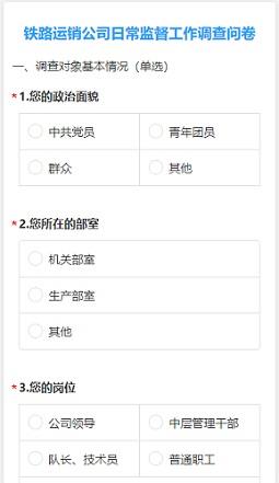 在一線走訪的基礎(chǔ)上,鐵路運(yùn)銷公司于7月21日-7月29日組織開展為期一周的“日常監(jiān)督工作”線上調(diào)查問卷活動。問卷設(shè)計(jì)8個單選題、8個多選題和1個主觀題,內(nèi)容涵蓋鐵路運(yùn)銷公司日常監(jiān)督工作基本情況、日常監(jiān)督工作范圍、監(jiān)督對象及需要改進(jìn)的地方等多方面問題。鐵路運(yùn)銷公司近50余人參與答卷,通過線上匿名問卷調(diào)查的方式,對鐵路運(yùn)銷公司日常監(jiān)督工作的落實(shí)和開展情況進(jìn)行“內(nèi)部體檢、內(nèi)部自查”,為進(jìn)一步完善和加強(qiáng)后期日常監(jiān)督工作奠定堅(jiān)實(shí)基礎(chǔ)。