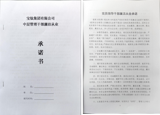 廉政談話結(jié)束后,寶鈦集團紀委還向新任職干部發(fā)放了《寶鈦集團有限公司中層管理干部廉潔從業(yè)承諾書》,要求新任職干部分別進行紙質(zhì)版、電子版承諾書和個人廉政檔案的填寫,為新任職干部建立廉政檔案。