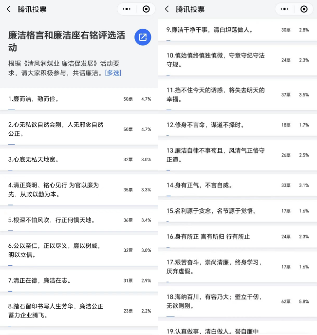 為了深入推進“清廉有色”建設,推動“清風潤煤業(yè)·廉潔促發(fā)展”系列活動扎實開展并取得實效,近日,榆林新材料煤業(yè)公司紀委組織開展廉潔格言和廉潔座右銘征集活動,并采取線上投票的方式對報送的36條優(yōu)秀格言進行評選,最終評選出“心底無私天地寬,利欲熏心路難行”、“心無私欲自然會剛,人無邪念自然公正”兩條優(yōu)秀廉潔格言。這一活動不僅讓黨員干部承諾踐諾,更讓廣大職工群眾充分參與進來,在公司范圍內形成人人參與清廉文化建設、共筑廉潔防線的良好氛圍。