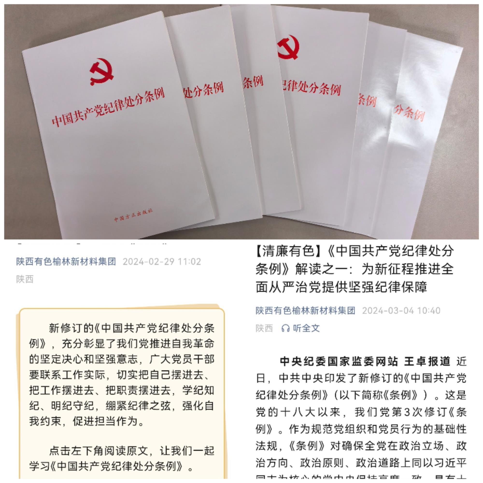 新修訂的《中國共產(chǎn)黨紀(jì)律處分條例》印發(fā)以來,榆林新材料集團紀(jì)委始終把學(xué)習(xí)貫徹《條例》作為一項重要政治任務(wù)和深入貫徹落實二十屆中央紀(jì)委三次全會精神及十四屆省紀(jì)委三次全會精神的重要舉措,切實發(fā)揮職能作用,主動做學(xué)習(xí)貫徹《條例》的實踐者、推動者、監(jiān)督者。